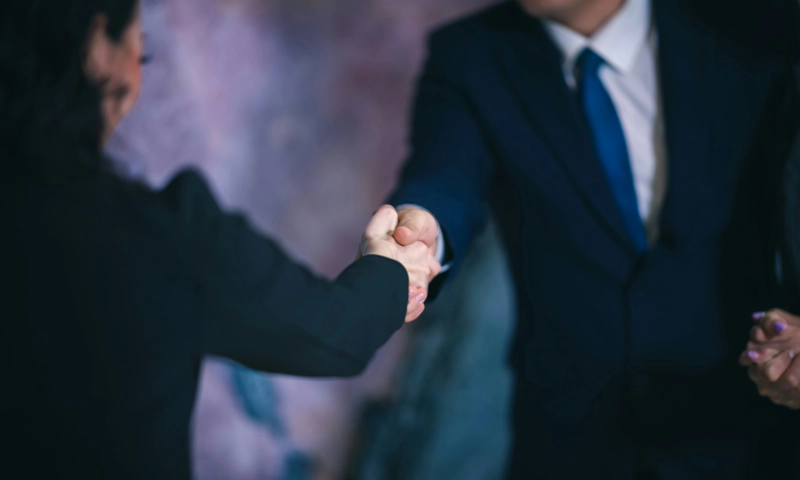 • A handshake between two businesspeople