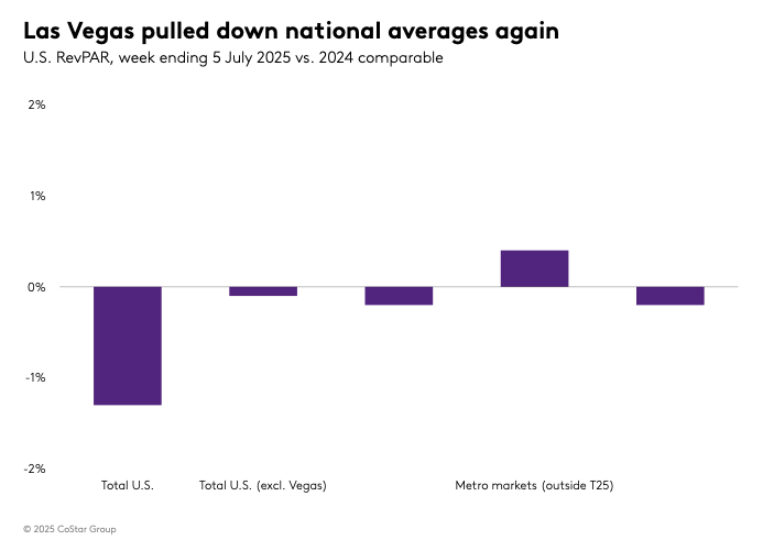 Las Vegas continued to exert a significant influence on national hotel metrics. The city experienced a substantial decline in RevPAR, down 28.7%, due to a 14.3% decrease in ADR and a 13.4 percentage point drop in occupancy. Given Las Vegas’ contribution to 3% of the U.S. hotel room supply, its performance notably impacts national averages. The city’s challenges were compounded by softening economic conditions and a decline in international arrivals, which fell by 13.2% in June. Excluding Las Vegas, the U.S. RevPAR remained relatively flat, with a slight decrease in ADR and a marginal increase in occupancy.