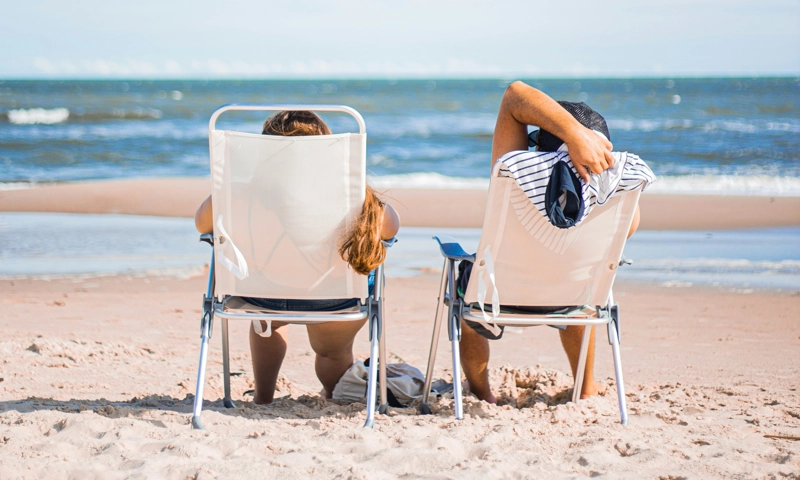 • Two people sitting in lawn chairs near a beach