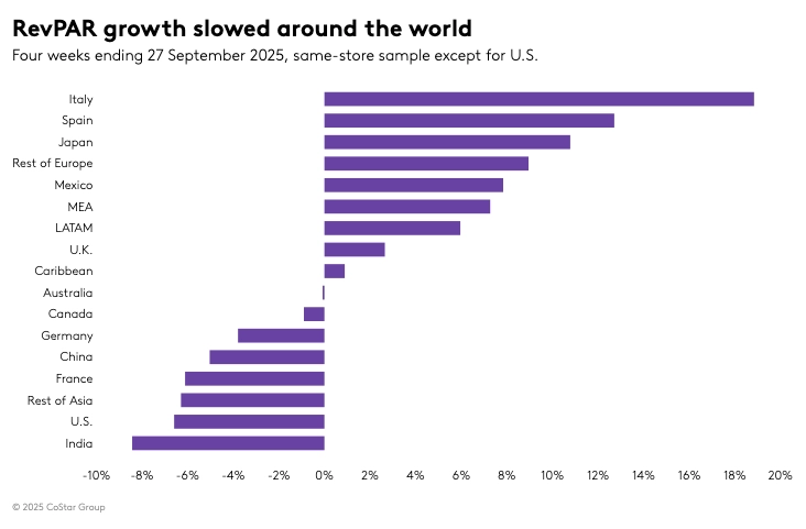For the week in question, U.S. RevPAR dropped by 6.6%, driven by a 2.8 percentage point decline in occupancy and a 2.5% decrease in ADR. This marks the 14th consecutive week of declining occupancy, a trend not seen since the end of the pandemic. The calendar shift of Rosh Hashanah, which began on a Monday, played a significant role in this decline, with the largest RevPAR decreases occurring on Monday (-12.4%) and Tuesday (-11.4%). The weekend saw a slight improvement in ADR, but it was insufficient to offset the week’s overall losses.