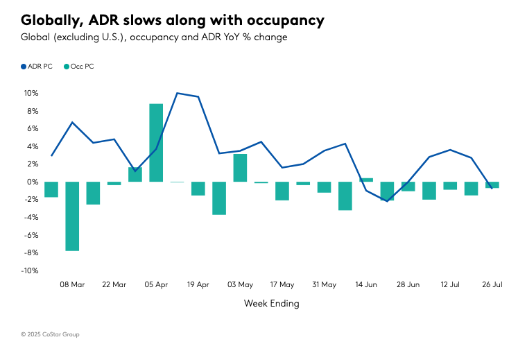 Globally, RevPAR excluding the U.S. declined by 1.5%, driven by decreases in occupancy (0.5 percentage points) and ADR (0.8%). Despite being the peak travel season, occupancy reached 73.4%, the highest level of the year thus far. However, occupancy has consistently declined over the past five weeks. ADR comparisons remained positive for most of the year, with negative readings occurring only four times, three of which were in the past seven weeks, indicating a slowdown in global pricing power.