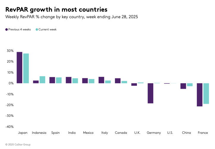 Globally, the hotel industry mirrored the U.S. patterns with a flat RevPAR at 0.2%. While ADR saw a 1.0% increase, occupancy declined by 0.6 percentage points. The global day-of-week pattern was similar, with a 3.0% increase in weekend RevPAR and declines of 1.0% and 0.9% during weekdays and shoulder periods, respectively. Despite the overall flat performance, nine of the 11 major countries reported positive results, with Japan leading, followed by Indonesia, Spain, and India.