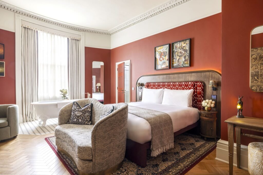 The hotel features a colour palette of ochre, red and indigo throughout its design. Its Classic and Deluxe rooms feature “soft neutrals, tactile materials and quietly detailed joinery”, while Grand rooms and Junior Suites have a “richer palette of paprika tones, expressive trims and curated furnishings”.